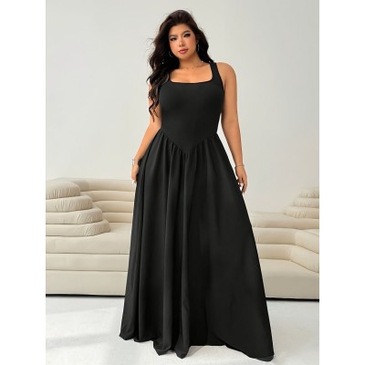 Plus Size - Women'S Plus Size Elegant Sleeveless Maxi Dress - V-Neck, Fit and Flare Silhouette, Medium Stretch, Solid Colo